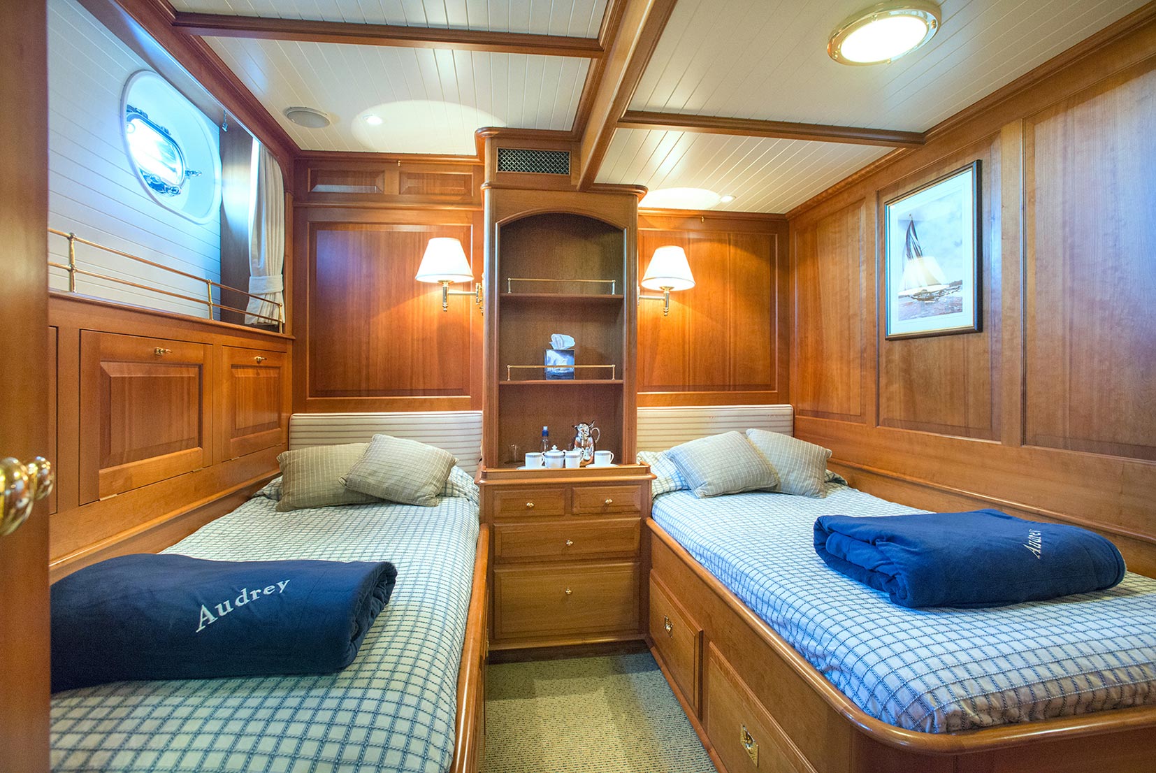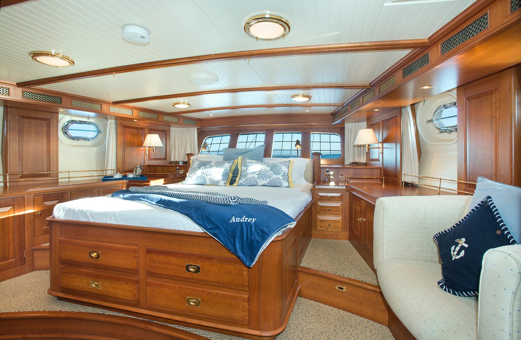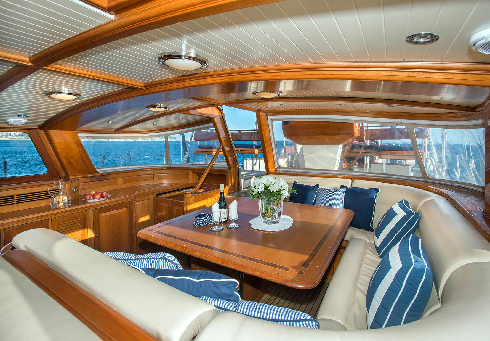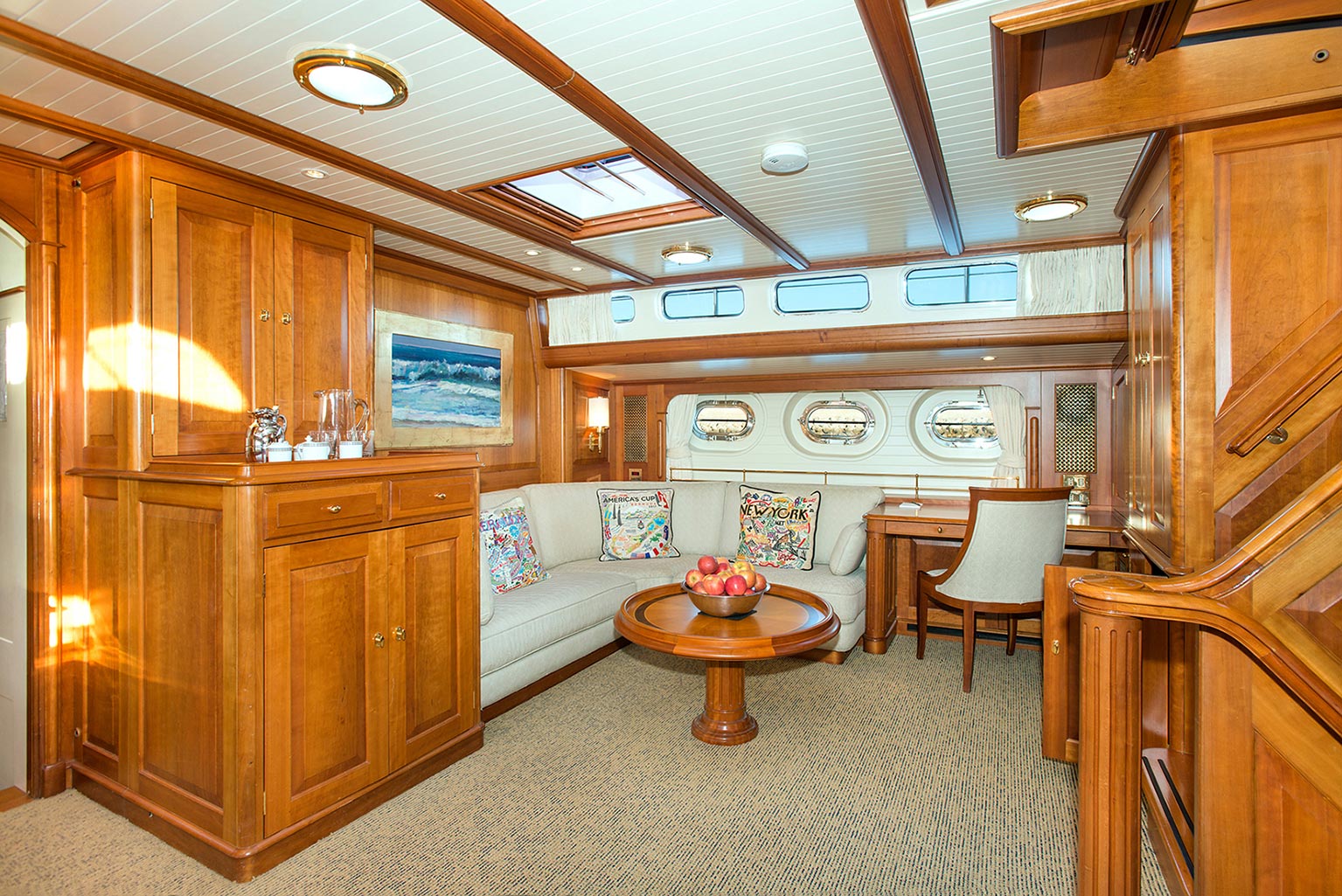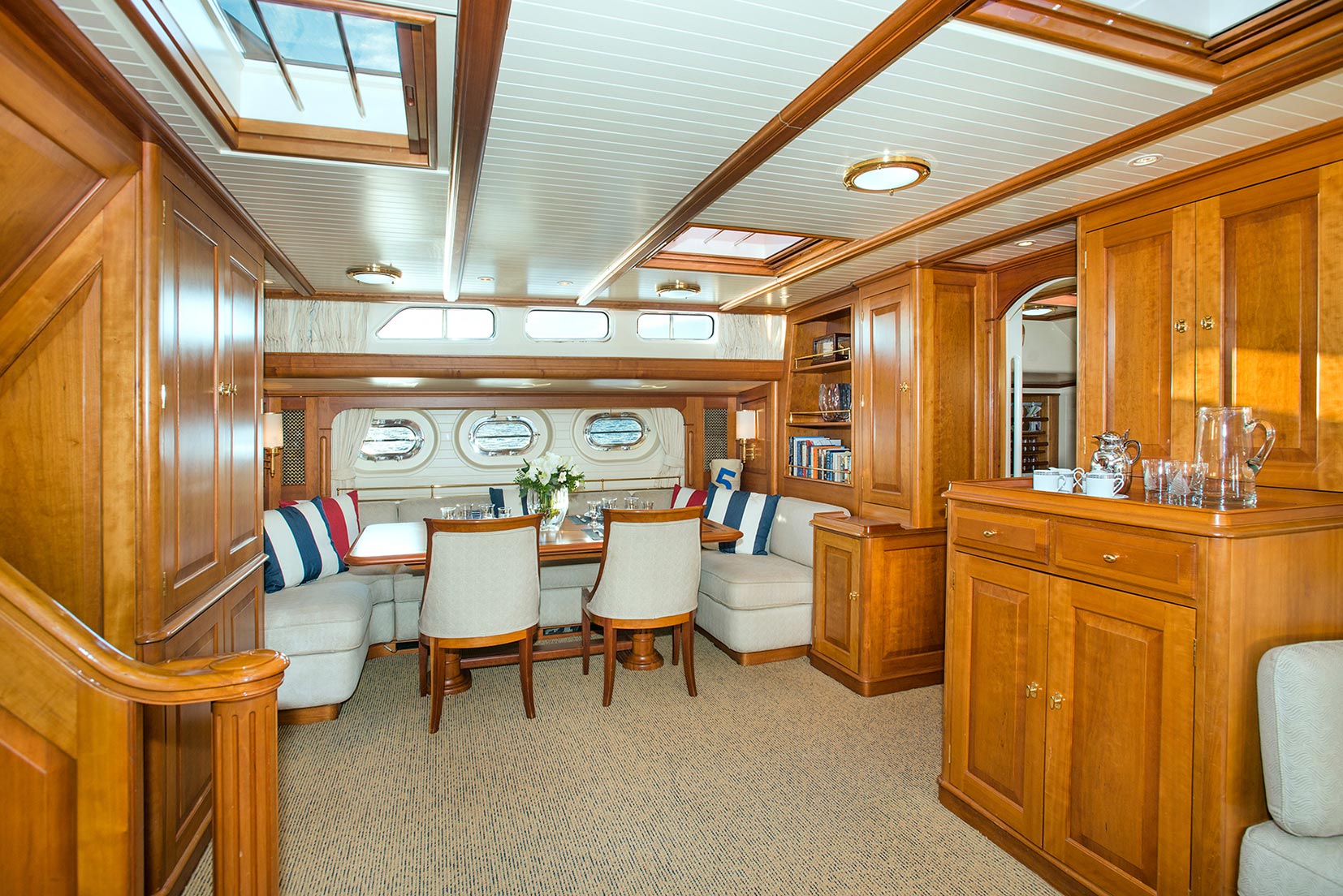 The interior was custom designed by John Munford. His American-cherry raised-panel interior is throughout the yacht below decks, including crew quarters. It is teak in the upper salon/pilothouse.