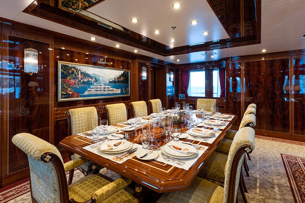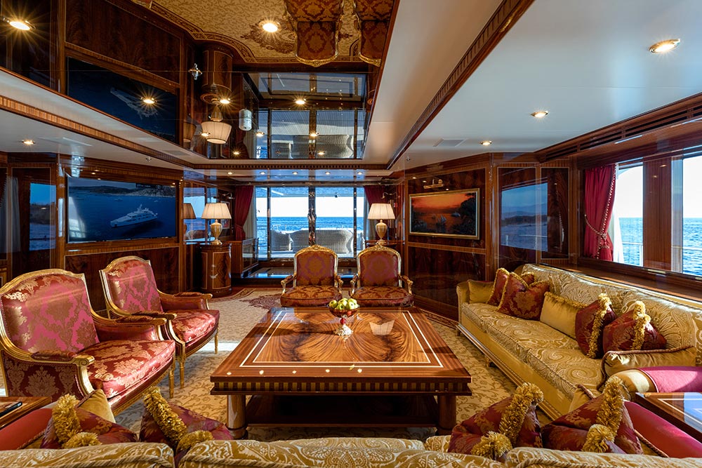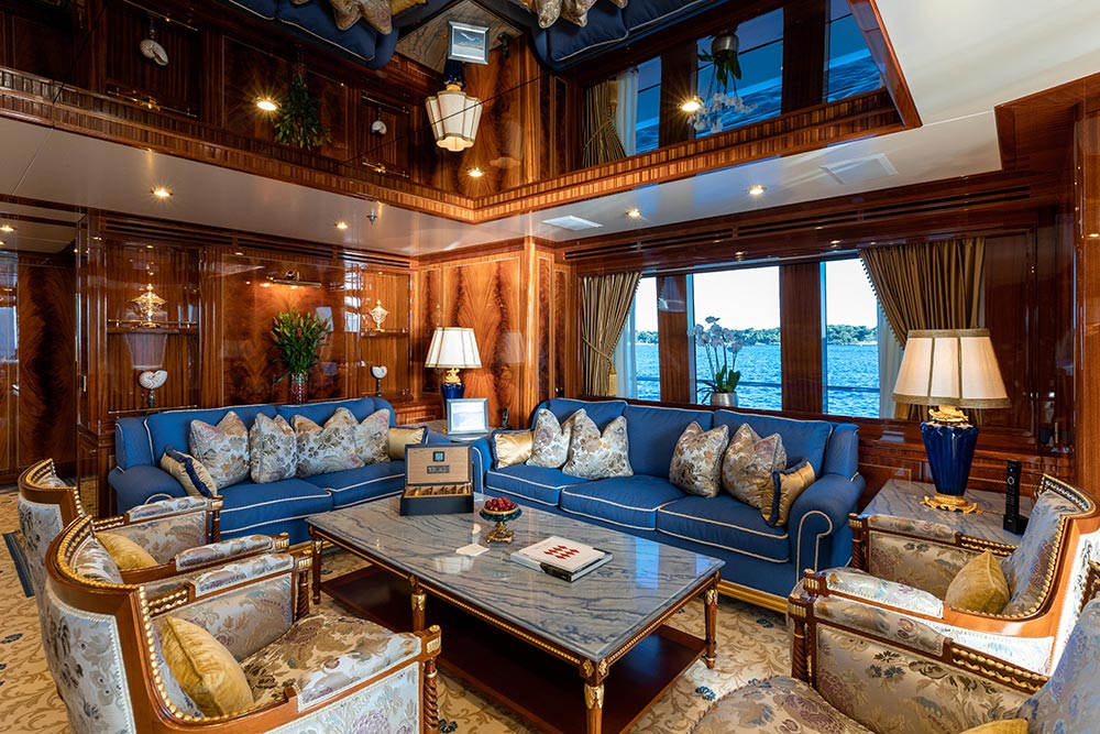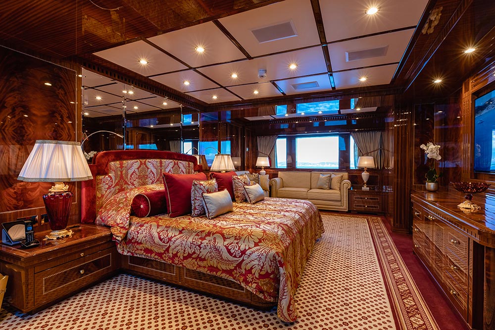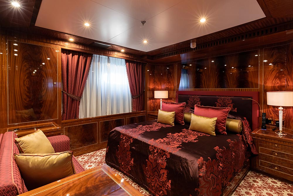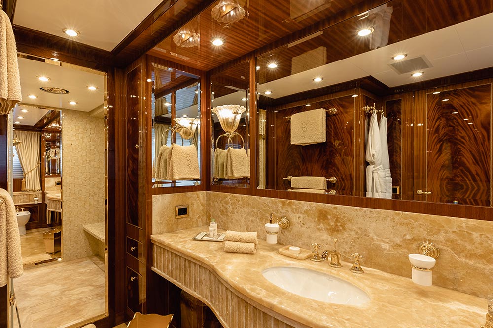 Interior designer Paolo Spano’s clever use of jewel-toned rich fabrics and contrasting colours compliments the warm mahogany wood and golden calacatta marble found throughout the yacht, giving the spacious interior an opulent feel. A decorative scheme with gold and honey-hued accents and exquisite custom furniture in classic styling complete the yacht’s luxurious finish.