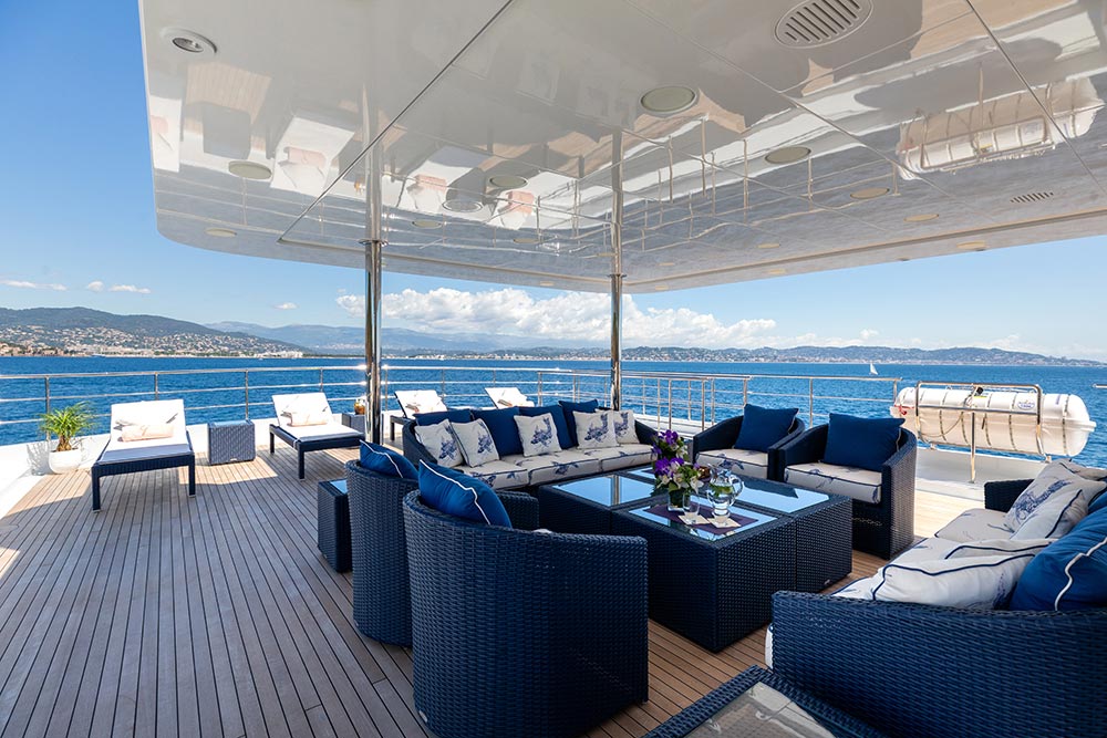 The main deck consists of a full-beam Owner’s Suite, study and double VIP cabin. With two double and two twin cabins (with additional Pullman berth) mirroring one another on the lower deck, she can comfortably accommodate up to 14 guests. Each cabin is equipped with its own exquisite en-suite bathroom. Her large exterior space offers multiple areas for relaxing and al-fresco dining, including a private seating area and a secluded spa pool on the sundeck. To provide extra comfort she is equipped with zero speed stabilisers and a guest elevator that serves all the decks, including the sundeck. For multimedia, larger twin Sea Tel antennas were fitted to ensure a robust satellite connection onboard.