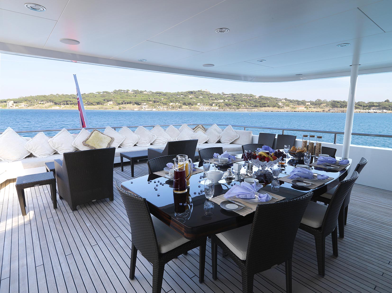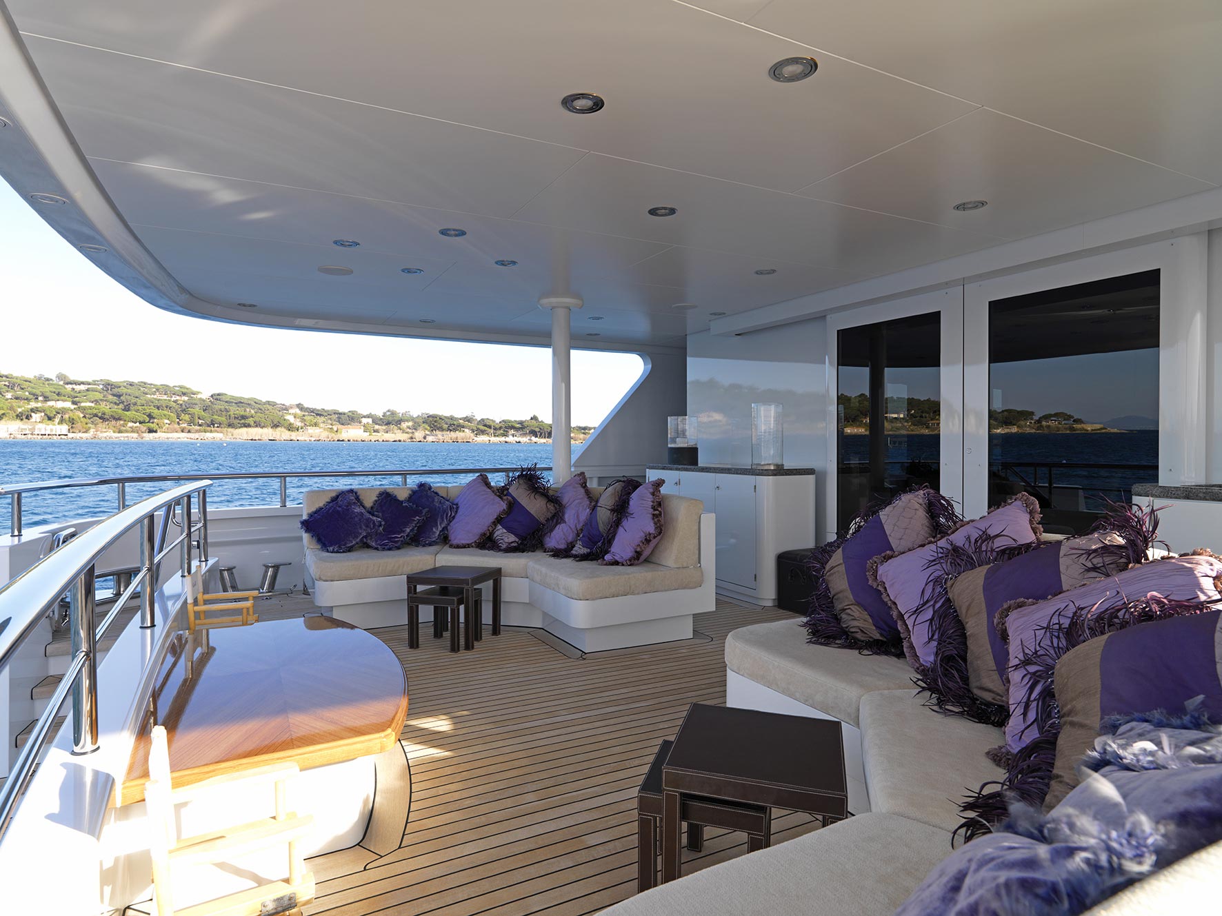 The interior furniture has been luxuriously upholstered in suede, cosy chenilles, silks and leather to create a warm and relaxed atmosphere. The extensive deck space is surprisingly spacious with the outdoor dining area joined to the main saloon to make a double lounging area. This luxury motor yacht also offers a professional, friendly crew and a good array of water toys.
