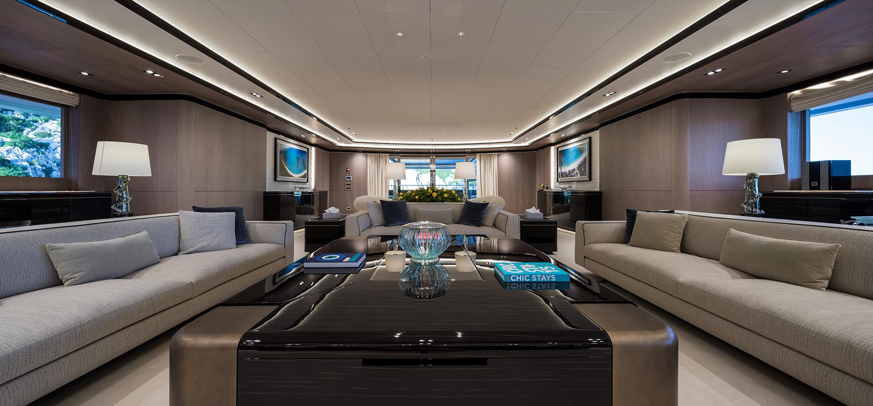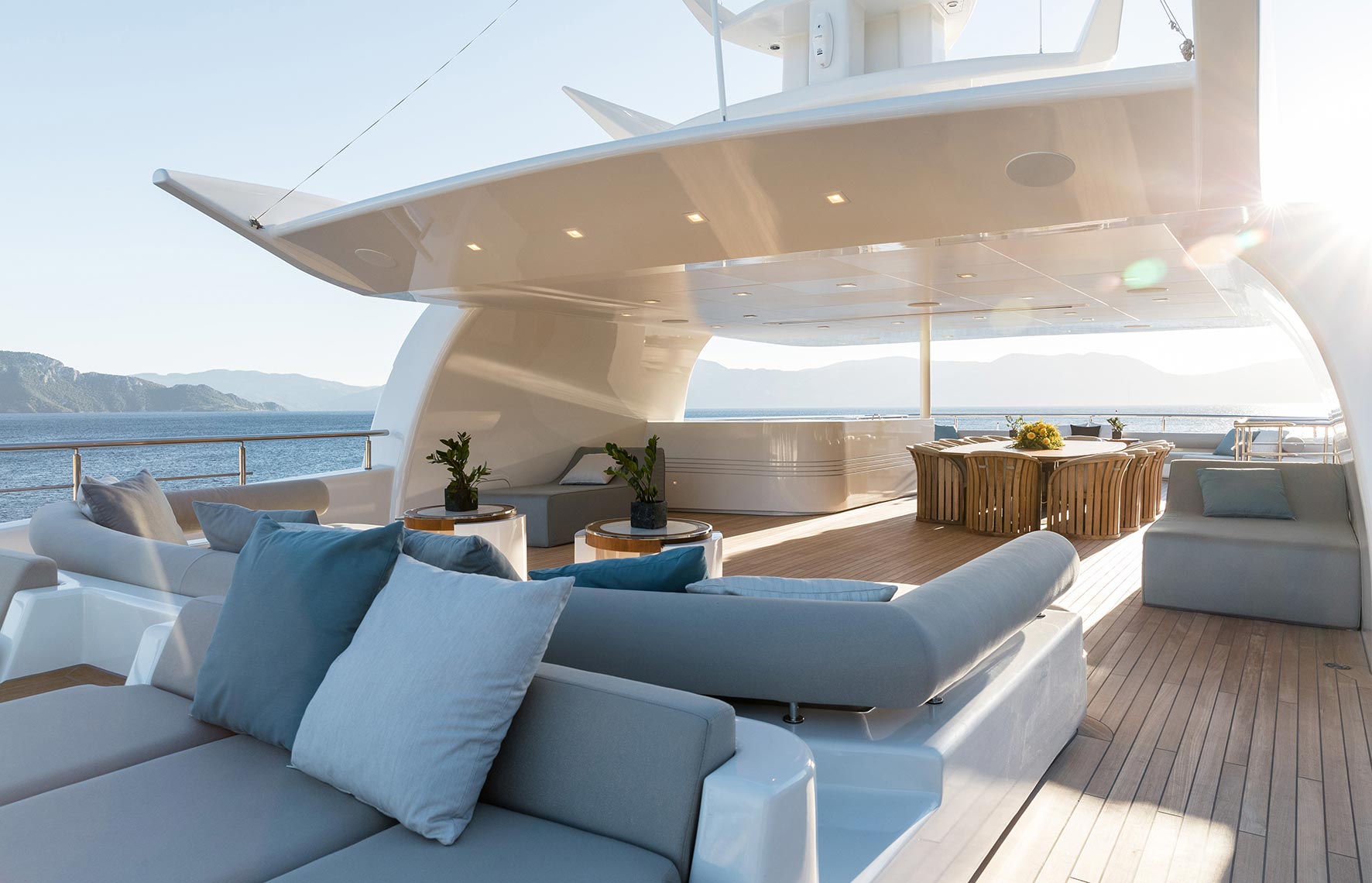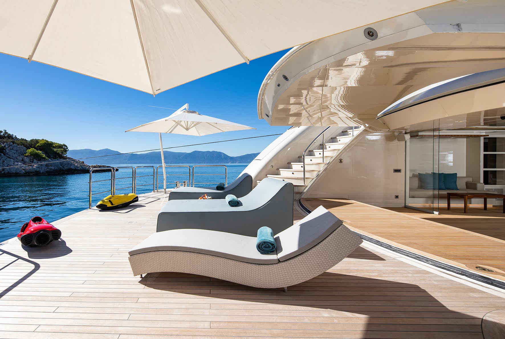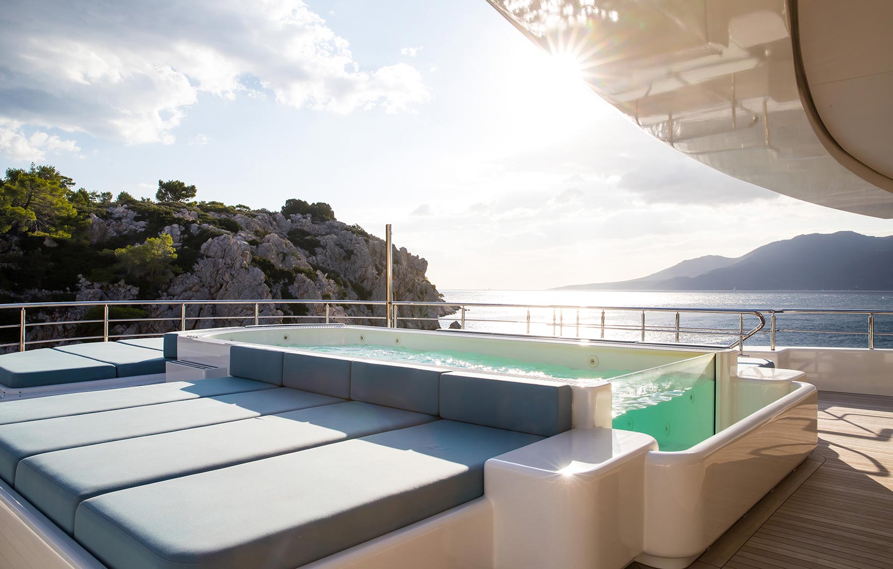 O’Ptasia’s interior layout sleeps up to 12 guests in 11 cabins, including a master suite, 1 VIP stateroom, 6 double cabins, 3 twin cabins and 1 convertible cabin. Her generous deck areas play host to a wide range of amenities including an outdoor bar, Jacuzzi and ample space for relaxation.