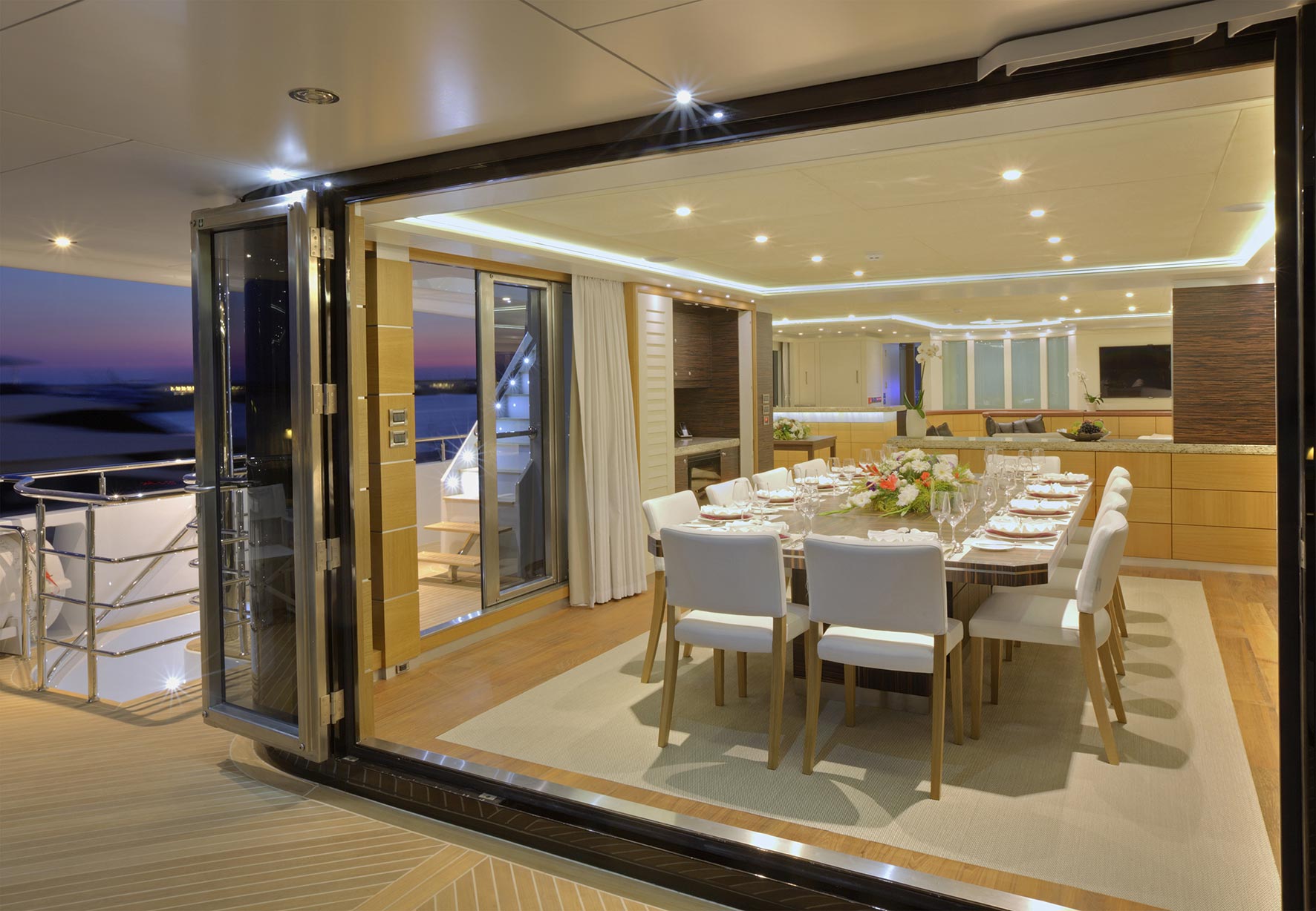 For a smaller party it is easy to convert the six on deck staterooms into three enormous ‘owners staterooms’, each with a his and hers bathrooms. Although a 34m 111′ superyacht catamaran, Quaranta has as much interior and exterior volume as other performance monohulls in the 40 > 42m range.