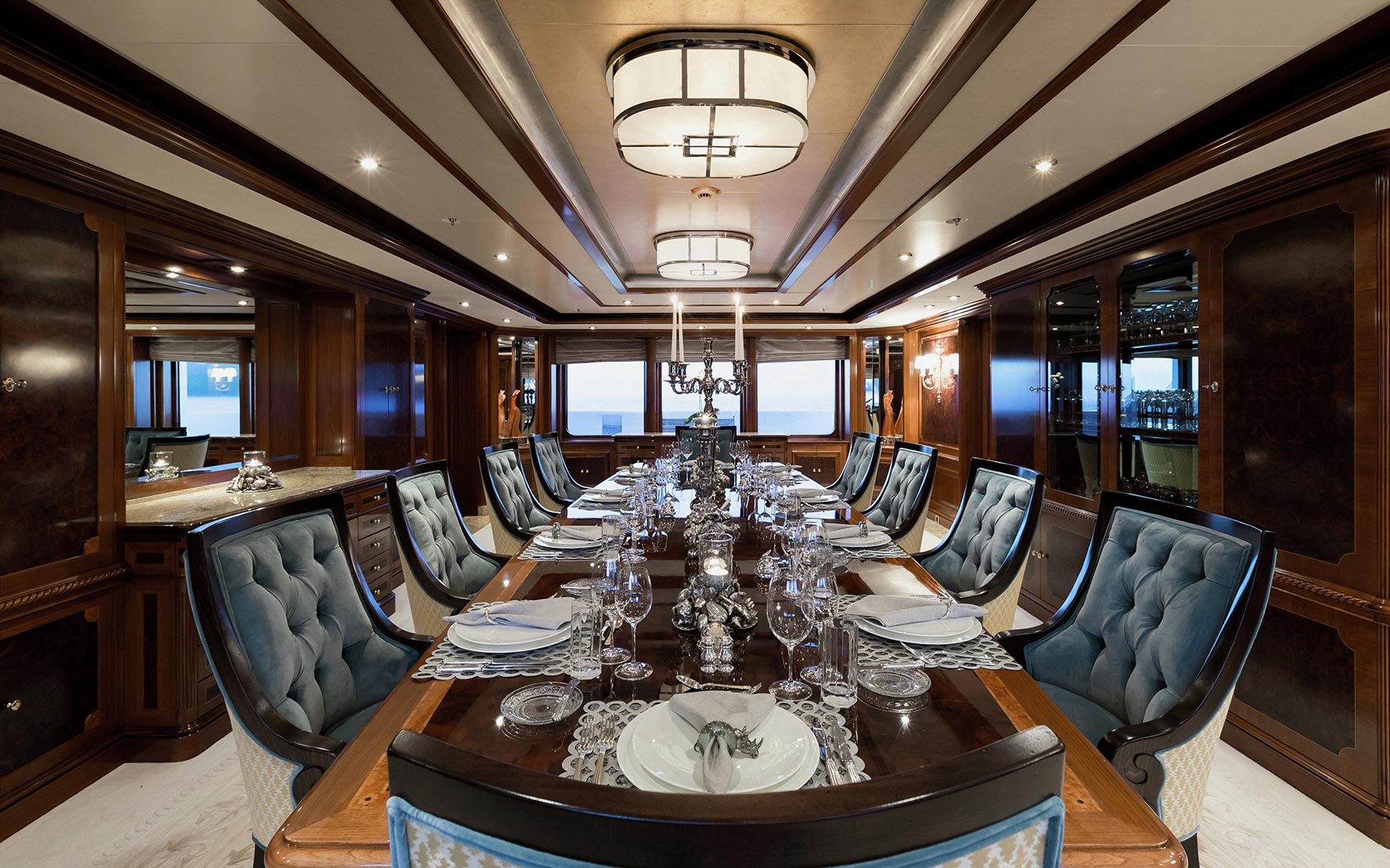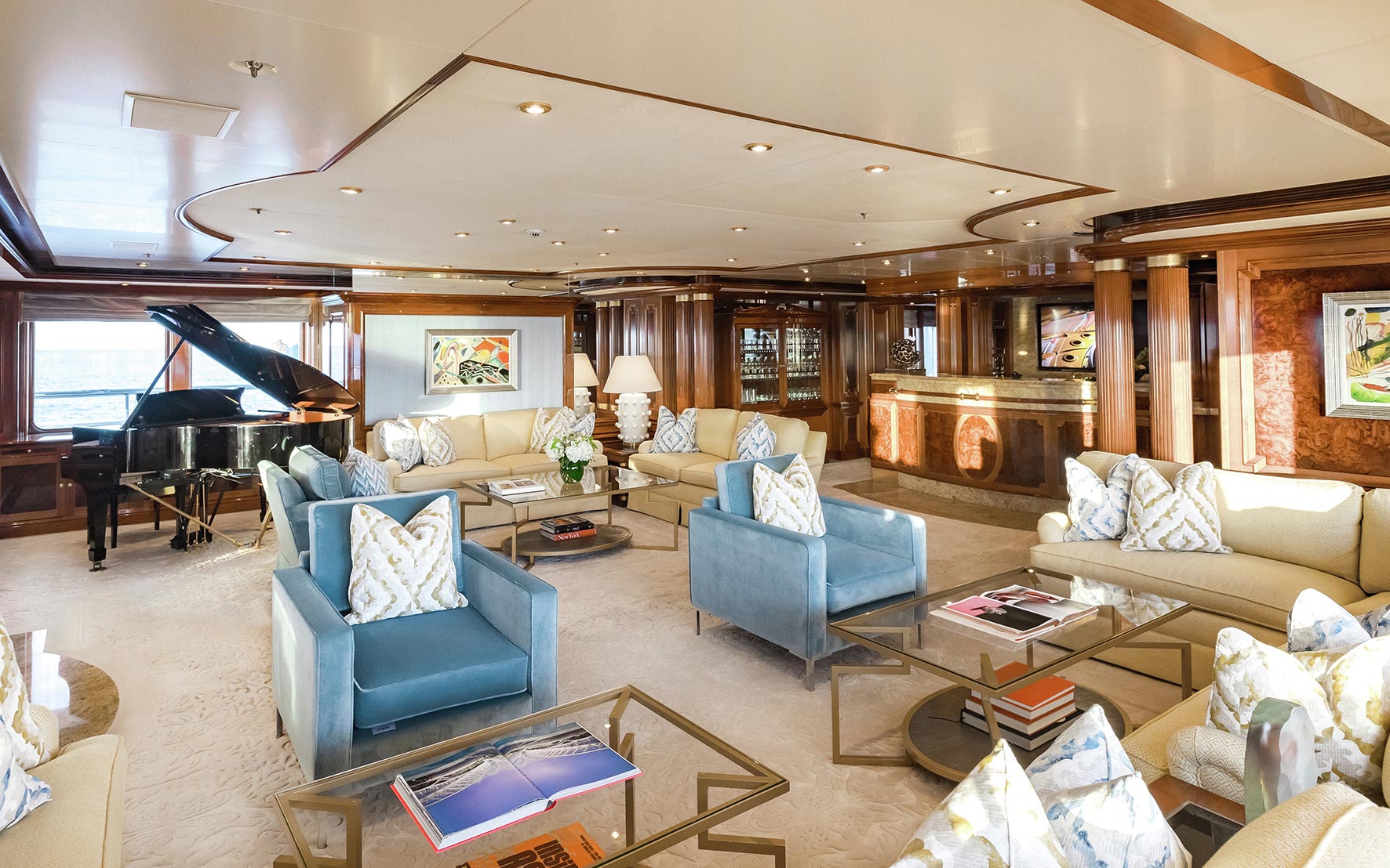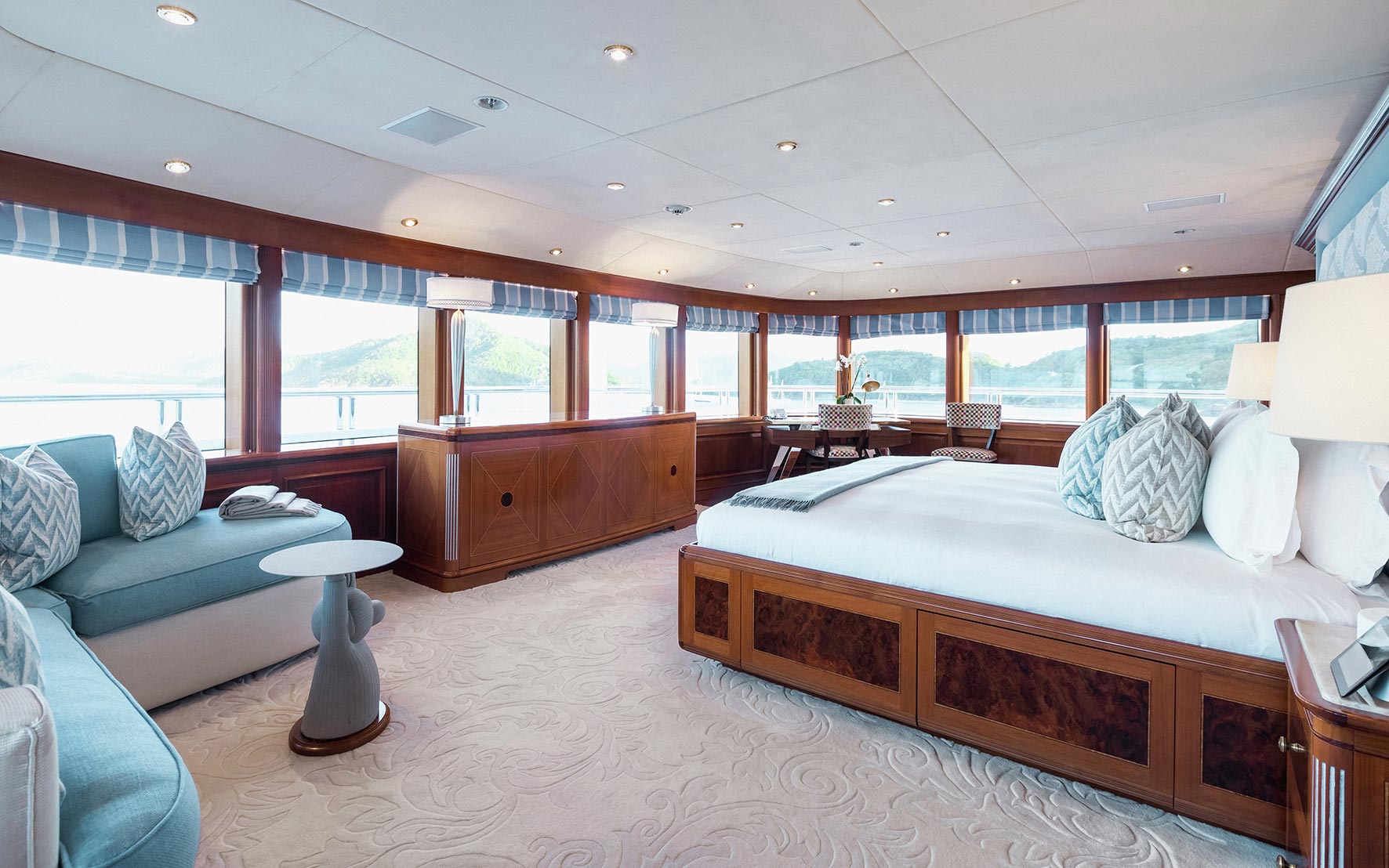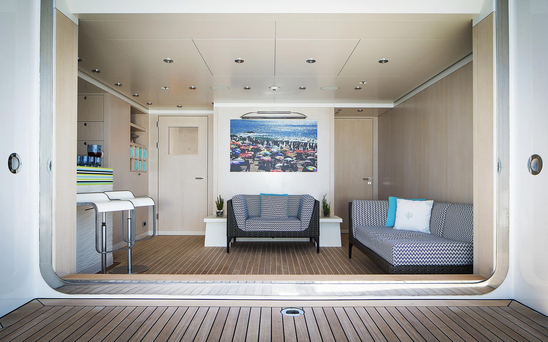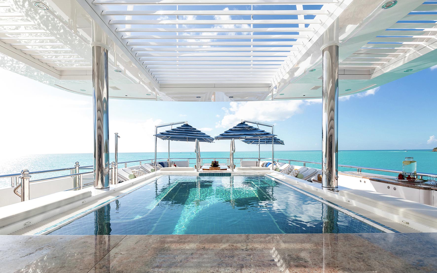 Titania’s exterior encompasses an ample selection of versatile outdoor living, dining and entertainment areas. Primed for panoramic views, the sundeck is a haven for sun lover’s seeking out relaxation while a multitude of leisure options are at hand on the ‘pool deck’ below where an inviting pool with a U-shaped swim-up bar is complemented by an alfresco dining setup. There are even more outdoor dining and lounging options on both the main deck and bridge deck below as well as a fabulous beach club.